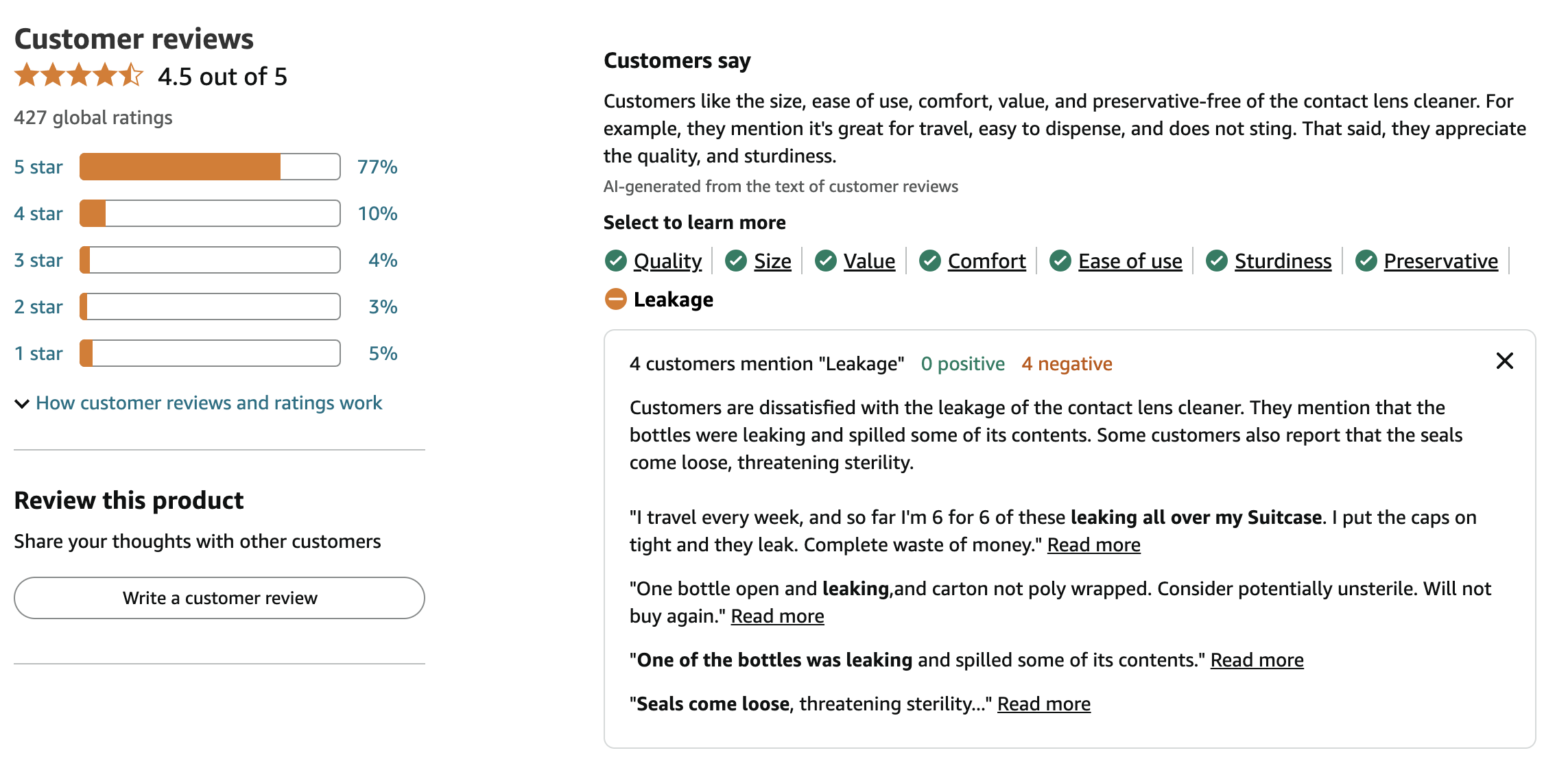 DEF has received multiple reports of leaking bottles and wet shipping boxes. DEF ordered its own bottle from Amazon and identified salt crusting on the exterior of the bottle and water stains on the box.