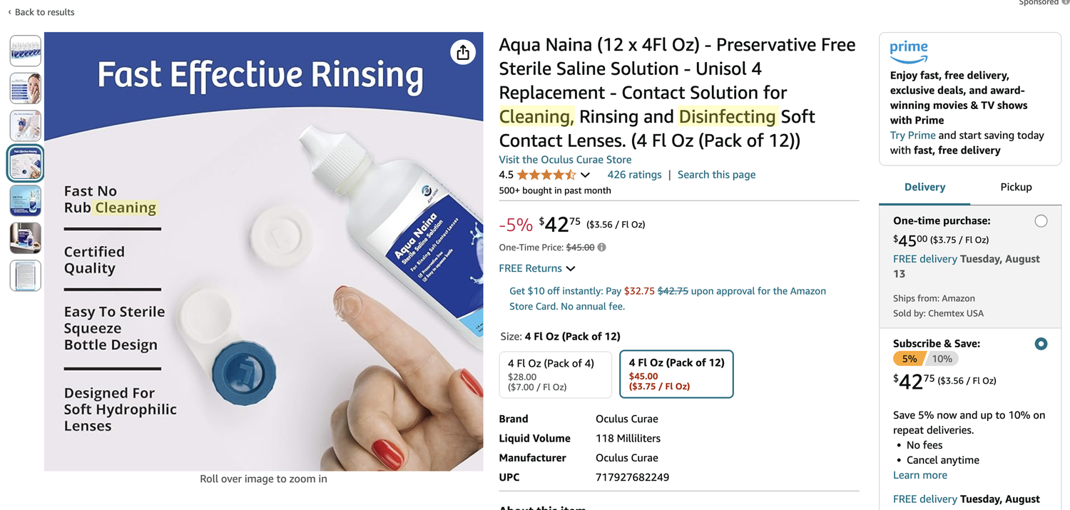 NOT SAFE FOR ADVERTISED USE: This solution has FDA clearance only for rinsing lenses just before you put them in your eye (after you have disinfected them with a disinfection solution). However, Aqua Naina is being advertised on Walmart for “cleaning, rinsing and storage,” and on Amazon for “cleaning, rinsing and disinfection.” Using a preservative-free saline solution to store contact lenses is a known risk factor for acanthamoeba keratitis, an extremely serious eye infection.